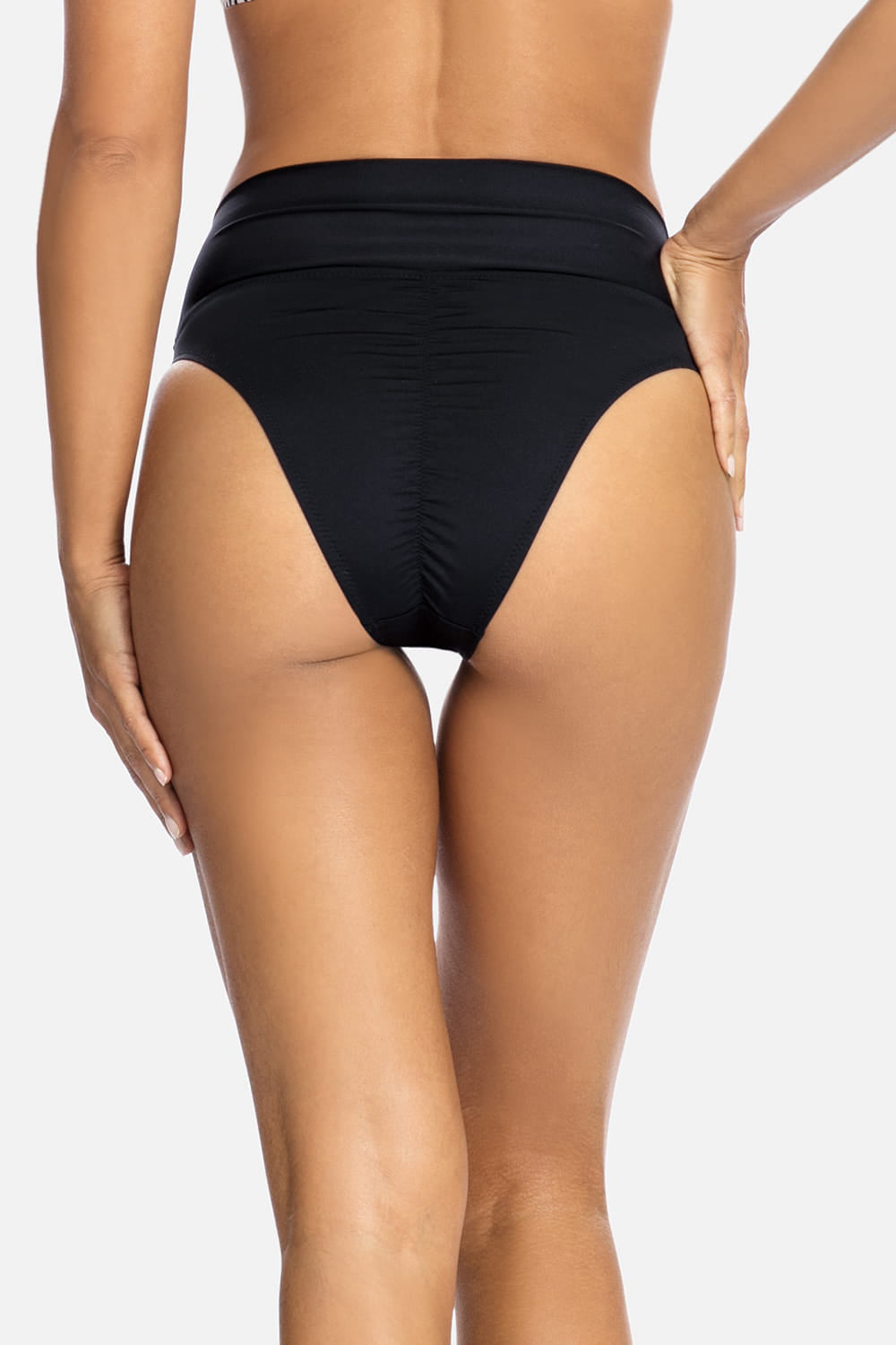 High-waisted bikini bottom. Focus on shaping and comfort! The high-waisted bikini bottom will sculpt the abdomen area and visually conceal figure imperfections. The back is slightly cut out with an intriguing vertical gathering in the center, accentuating and enhancing the shape of the buttocks (push-up effect). The modern cut of high-waisted bikini bottom is one of the trendiest this season. Bikinis with a high waist are a stylish proposition for women with various body shapes, both slender and curvier. These swim bottoms not only look great but also serve many practical functions: they streamline critical body parts and cover up what you want to mask, emphasize the waist, flatten the stomach, and optically elongate the legs.